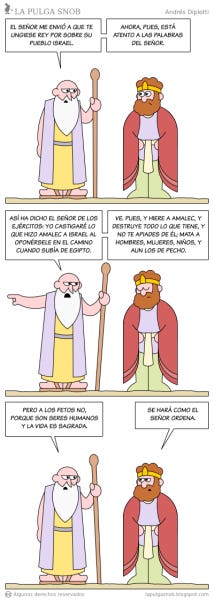 —El Señor me envió a que te ungiese por rey sobre su pueblo Israel; ahora, pues, está atento a las palabras de Jehová. Así ha dicho el Señor de los ejércitos: Yo castigaré lo que hizo Amalec a Israel al oponérsele en el camino cuando subía de Egipto. Ve, pues, y hiere a Amalec, y destruye todo lo que tiene, y no te apiades de él; mata a hombres, mujeres, niños, y aun los de pecho. Pero a los fetos no, porque son seres humanos y la vida es sagrada.