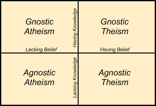 Los agnósticos dicen a menudo que podemos creer en un dios (o no creer), pero no podemos saber si existe uno o no. Vamos a dejar de lado la obvia objeción de que si existiera un Dios podría hacernos una visita y decir hola, ¡soy el creador! Creo que los agnósticos lo saben y lo desechan porque nunca ha sucedido y es, a primera vista, poco probable. Así que tenemos creencias y conocimientos. ¿Qué significan estas palabras? En las discusiones AvA [Ateísmo vs. Agnosticismo], la creencia se toma como algo que no se puede probar o para lo que no se tiene evidencia, el conocimiento es una proposición que un observador racional se ve obligado a aceptar gracias a la prueba directa o un argumento convincente. El agnóstico tiende a insistir en que el conocimiento y la creencia son categóricamente diferentes. Tan diferentes, que tienen que estar en diferentes ejes: