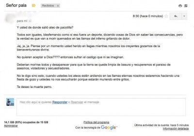 Pues así como sucede con muchos divulgadores y escépticos en Internet, Pala también se ha ganado haters por decir cosas que a ellos no les gustan — el ataque personal es el recurso de quien se queda sin argumentos (o que nunca los tuvo). Y uno de esos haters consiguió el correo personal de Pala y le envió todo un rosario de amor cristiano: