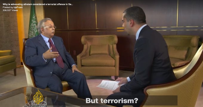 HASAN: Cuando nos fijamos en la situación de derechos humanos en Arabia Saudita, por ejemplo, algunos dirían que hay algunas resoluciones extrañas. ¿Por qué abogar por el ateísmo en Arabia Saudita ahora es considerado como un delito terrorista? ¿Cómo explica eso?