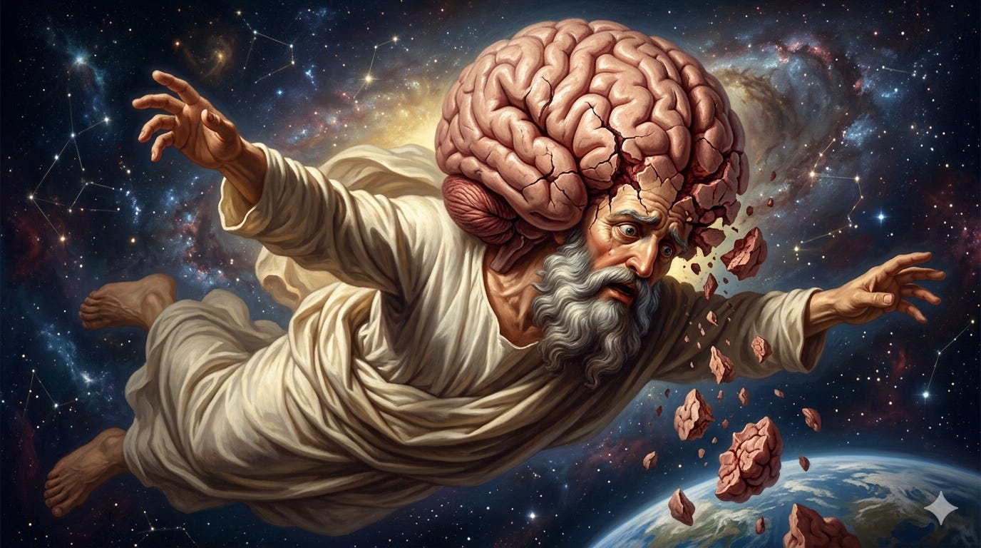 A partir de ahí, la idea de una conciencia capaz de crear el universo, presentarse ante nosotros, hablarnos, asignar propósito a nuestras vidas, dictar o inspirar un libro, y además premiarnos o condenarnos después de la muerte, se vuelve insostenible. No existe evidencia de que algo así sea físicamente posible. Tampoco hay evidencia de que el cuerpo necesario para sostenerlo pudiera existir sin colapsar bajo sus propias limitaciones físicas. Y, hasta donde sabemos, tampoco hay rastro de la infraestructura biológica que haría posible tal organización de la materia.