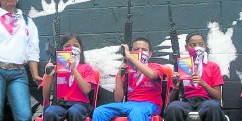 Y tan poco se preocupan en mostrarse que el pasado lunes uno de los más famosos colectivos de la zona -llamado La Piedrita- hizo un acto para conmemorar la fecha que da nombre al barrio con una docena de niños con el rostro cubierto y tres de ellos portando armas largas.