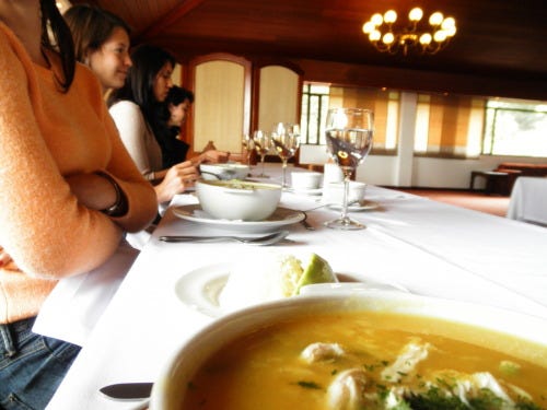 También tenemos la Casa Externadista. De ella siempre nos dijeron que el precio de los platos era exorbitante, que sólo se podía ir a almorzar allá previa reserva y que no se permitía la entrada de nadie que estuviera en tenis y jeans. Nunca había ido, sin embargo, la oportunidad se me presentó este lunes 14 de mayo, cuando Luz Amalia Camacho, la decana de la facultad de Comunicación Social, nos invitó a los representantes de todos los semestres a despedir el Consejo Estudiantil del Programa.