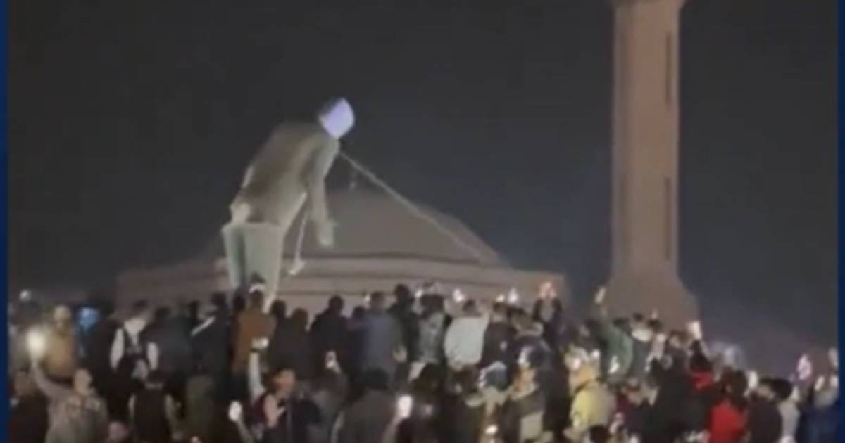 (imagen, de ciudadanos sirios tumbando una estatua de Háfez al-Assad: NBC)