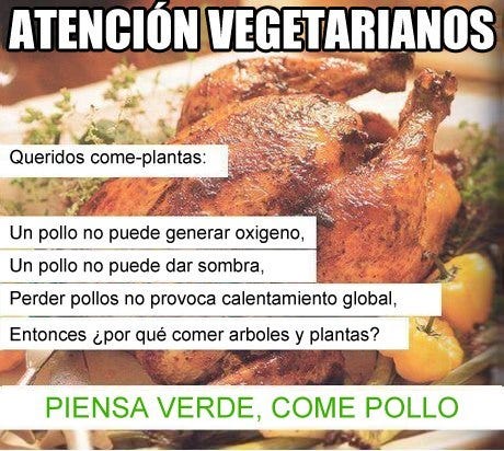 Un pollo no puede generar oxígeno, un pollo no puede dar sombra, perder pollos no provoca calentamiento global, entonces, ¿por qué comer árboles y plantas?