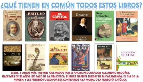 Además señaló que gracias a una columna escrita por el periodista Daniel Coronell saben el nombre de los autores de esos libros, Carlos Marx, Descartes, Nietcheze, Gabriel García Marquez, Victor Hugo, Marcel Proust, Rousseau, unas revistas de educación sexual, una biblia que era de traducción protestante y no católica, entre otros.