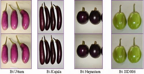 Verdad: las variedades de berenjena Bt no son nuevas variedades - son las mismas que las viejas variedades que los agricultores prefieren, excepto que tienen genes que significan que pueden resistir el ataque de plagas de insectos. La berenjena es en gran medida auto-polinizada, lo que significa que el polen rara vez sale de la planta, y sólo es transportado por insectos visitantes a una corta distancia (un máximo de 30 metros) de la planta. Por eso, los agricultores de berenjena comúnmente cultivan distintas variedades muy cerca la una de la otra y sin embargo, todavía se reproducen así en la siguiente generación de semillas. Las pruebas han demostrado que la "fecundación cruzada" de berenjena Bt a otras variedades no es más común que en sus contrapartes no-Bt. Por lo tanto, las semillas de berenjena no Bt seguirán estando disponibles como antes a los agricultores que las prefieran. No hay peligro de que la berenjena Bt de alguna manera 'invada' la tierra de los agricultores - la berenjena es un cultivo frágil que requiere la cultivación humanos y mantenimiento, intensivos, todo lo contrario de una especie invasora. Existe cierto debate sobre el grado en que de berenjena tiene su "centro de origen" en el sur de Asia. La especie Solanum a la que pertenece la berenjena (que también incluye la papa y el tomate, así como la planta silvestre venenosa belladona) probablemente se originó en América del Sur. Algunos parientes silvestres de la berenjena existen en el sur de Asia, pero fecundación cruzada y la polinización cruzada para ellos no es más probable con la berenjena Bt que con la berenjena convencional. Además, como los genes Bt no confieren ninguna ventaja selectiva en especies no cultivadas (que no son atacadas por las mismas plagas) estos no confieren ninguna ventaja selectiva y, por tanto, no se conservarán en la naturaleza.