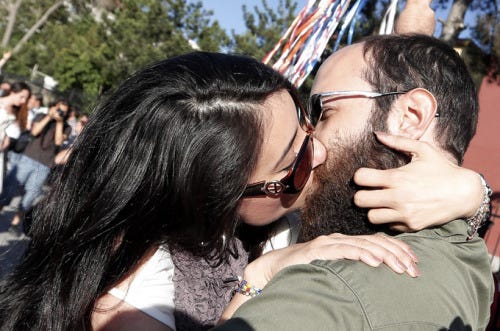 Cerca de 100 personas se besaron en la estación el sábado durante varios minutos para protestar. Los manifestantes portaban carteles que decían "Besos gratis'' y coreaban consignas.