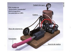 En 1869, el médico estadounidense George Taylor patentó un vibrador a vapor llamado The manipulator. Más tarde, en 1880, el doctor inglés Joseph Mortimer Granville inventó el primer vibrador electromecánico con forma fálica. El mecanismo era muy ingenioso: el calderón de vapor, mediante la correa de transmisión, movía una cadena que, al girar, alimentaba una dinamo. Esta cargaba la batería que daba corriente al motor eléctrico y ponía en movimiento el émbolo del dildo. Fue en 1902 cuando la empresa estadounidense Hamilton Beach comercializó el primer vibrador eléctrico para venta al por menor.