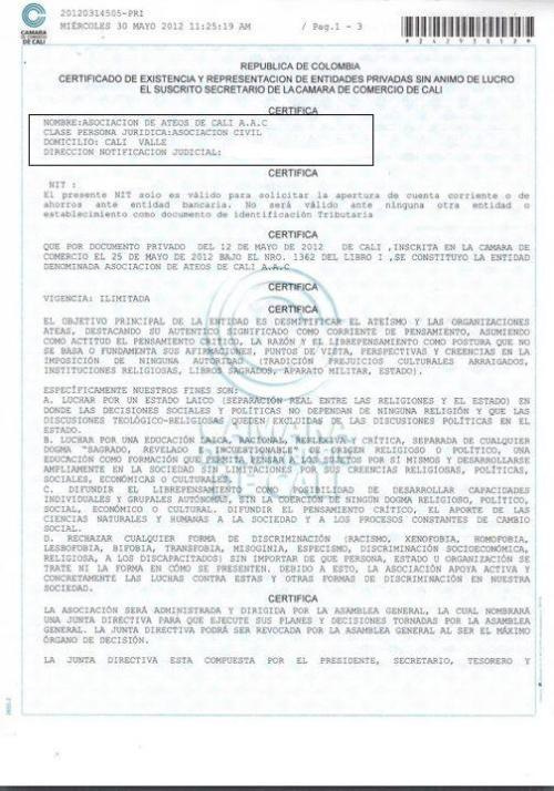 Debo decir que estoy sorprendido. Veo que el activismo ateo está cogiendo fuerza en el país y eso me alegra. Aunque pensaba que en Bogotá íbamos a ser los primeros, resulta que en Cali se nos han adelantado y ya constituyeron la primera asociación de ateos conformada legalmente en la historia de Colombia: