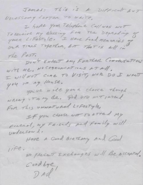 James: Esta es una carta difícil, pero necesaria de escribir. Espero que tu llamada telefónica no fuera para recibir mi bendición para la degradación de tu estilo de vida. Tengo buenos recuerdos de nuestro tiempo juntos, pero está todo en el pasado.