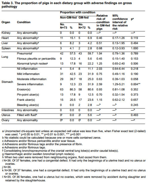 "Pero los cerdos que consumieron la dieta transgénica tuvieron una tasa más alta de inflamación estomacal - 32 por ciento de los cerdos alimentados con transgénicos en comparación con el 12 por ciento de cerdos alimentados con no-transgénicos. La inflamación fue peor en los machos alimentados con transgénicos en comparación con los machos alimentados con no-transgénicos por un factor de 4,0, y las hembras alimentadas con transgénicos en comparación con las hembrasalimentado con no-transgénicos por un factor de 2,2".