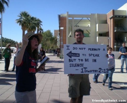 Tenían una impresora de camisetas que se usaba para poner versículos. Pregunté si una impresión de una camiseta de Timoteo 2:12 era razonable. Como cristianos, ellos nunca habían mirado tan lejos en la Biblia, por lo que miraron en la Biblia que tenían a la mano en el sitio. Cuando recitaron el versículo (Una mujer resultó ser la lectora de la Biblia) ellos informaron que era una falta de respeto de su religión lo que yo estaba haciendo. Yo no estaba seguro de cómo estaba siendo irrespetuoso por preguntar un verso de su libro sagrado.
