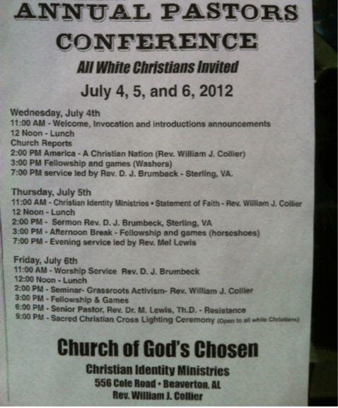 El organizador del evento, el reverendo William C. Collier dice que su Iglesia de Los Elegidos de Dios (Ministerios Cristianos de Identidad) no es un grupo de odio, pero añade que cree que "la raza blanca es el pueblo escogido de Dios".