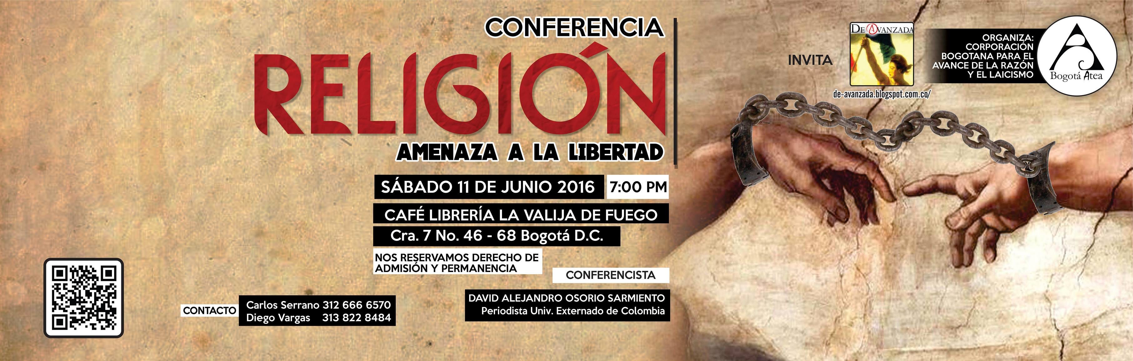 El otro evento será la charla Religión: Amenaza para la Libertad, a cargo de este servidor, como parte del ciclo de conferencias 'Ateísmo para Todos' de Bogotá Atea —a quienes agradezco la cordial invitación—.