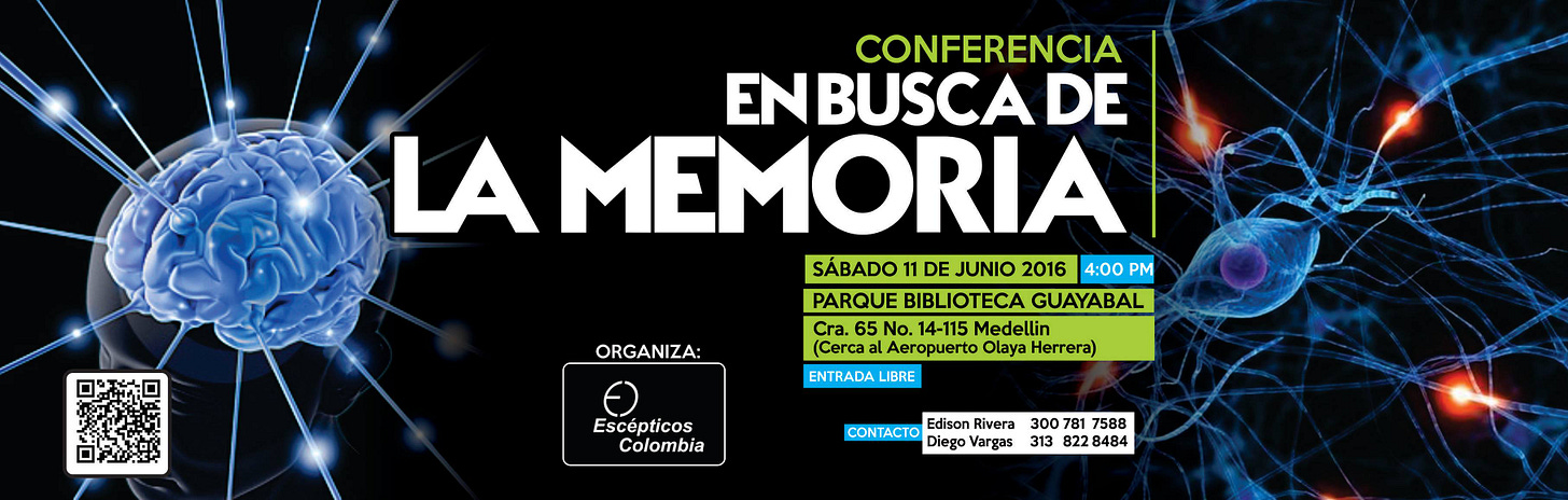 Mañana, sábado 11 de junio, habrá dos conferencias en Colombia. La primera, En busca de la memoria, es ofrecida por Escépticos Colombia en Medellín — para quienes no puedan asistir, la conferencia será transmitida por streaming.