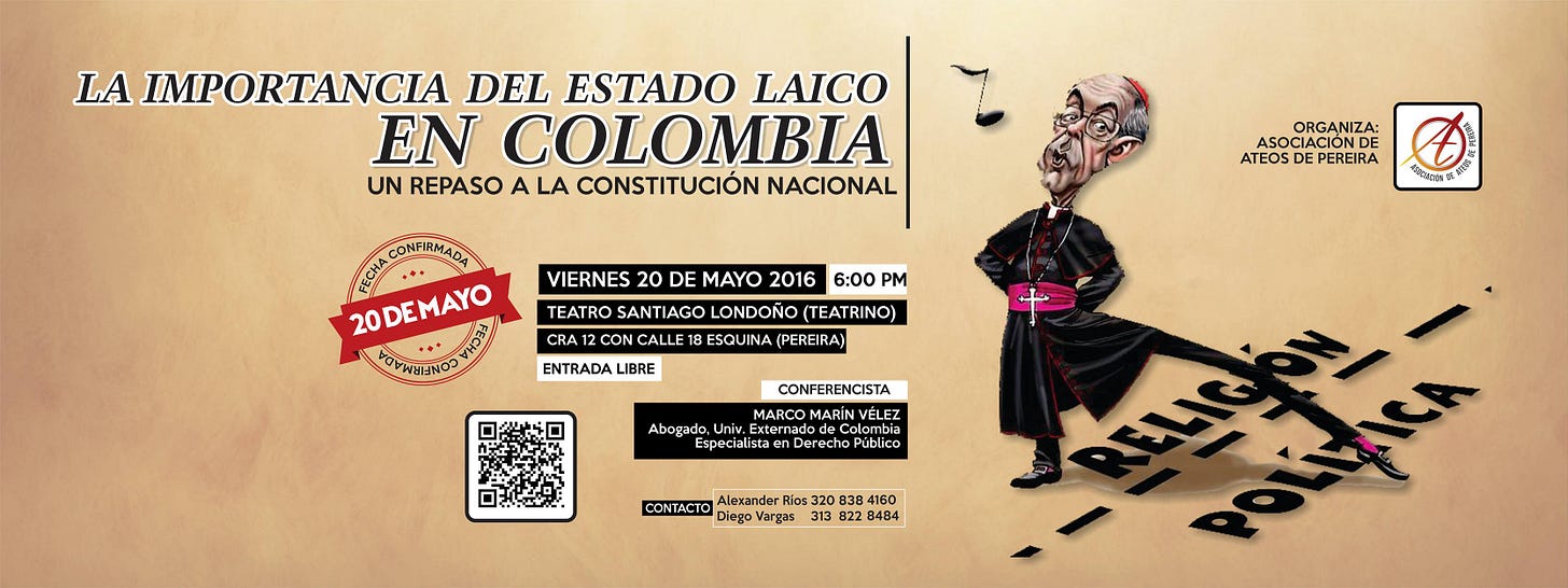 En mayo, en Colombia tendremos tres conferencias interesantes. La primera será La importancia del Estado laico en Colombia, organizada por la Asociación de Ateos de Pereira (AAP) — esta conferencia estaba programada para abril pero por un asunto de fuerza mayor debió posponerse.