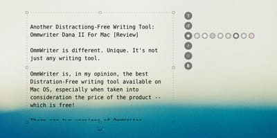 OmmWriter Dana se enfoca en los sentidos, con un diseño simple –enfocado en brindar un ambiente libre de distracciones–, que brinda la posibilidad de manejar diferentes tipos y tamaños de letra, desplegar el contenido en pantalla completa, compartir en redes sociales y descargar el archivo en formato PDF.