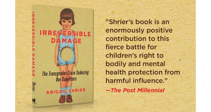 Me pareció que eso merecía ser investigado. Recibí muchas críticas por escribir sobre ello. Incluso me llamaron transfóbica, cosa que no soy en absoluto. Sólo quiero lo mejor para cada persona. Si eso significa hacer la transición, lo apoyo totalmente. Si eso significa que algunas personas hacen la transición por razones equivocadas y luego cambian de opinión, eso es lamentable y tenemos que encontrar una mejor forma de identificar a esas personas y tratar su disforia sin someterlas a intervenciones irreversibles. Dudé en abordar de nuevo este controvertido tema, pero en 2020 Abigail Shrier escribió un libro que comparte mis preocupaciones y las de Littman. Combina hechos bien investigados con historias escalofriantes sobre cirugías chapuceras, personas que luego se arrepienten de sus decisiones y terapeutas que no están proporcionando terapia, sino que solo validan el autodiagnóstico de sus pacientes. El título es Irreversible Damage: The Transgender Craze Seducing Our Daughters (Daño irreversible: La moda transgénero que seduce a nuestras hijas).