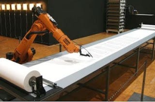 El robot KR16, de fabricación alemana y probado en Sevilla, empezó la semana que pasó con la tarea de escribir la Biblia, a pluma y en cuidada caligrafía medieval, ante la puerta de la catedral de Tréveris (oeste de Alemania).