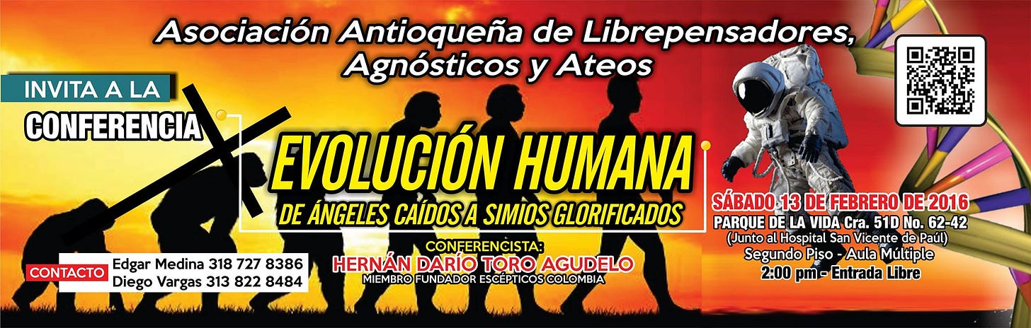 La Asociación Antioqueña de Librepensadores, Agnósticos y Ateos invita a la conferencia 'Evolución Humana: De ángeles caídos a simios glorificados', que se llevará a cabo el sábado 13 de febrero en el Parque de la Vida Medellín, a partir de las 2:00 p.m. y será dictada por Hernán Toro.