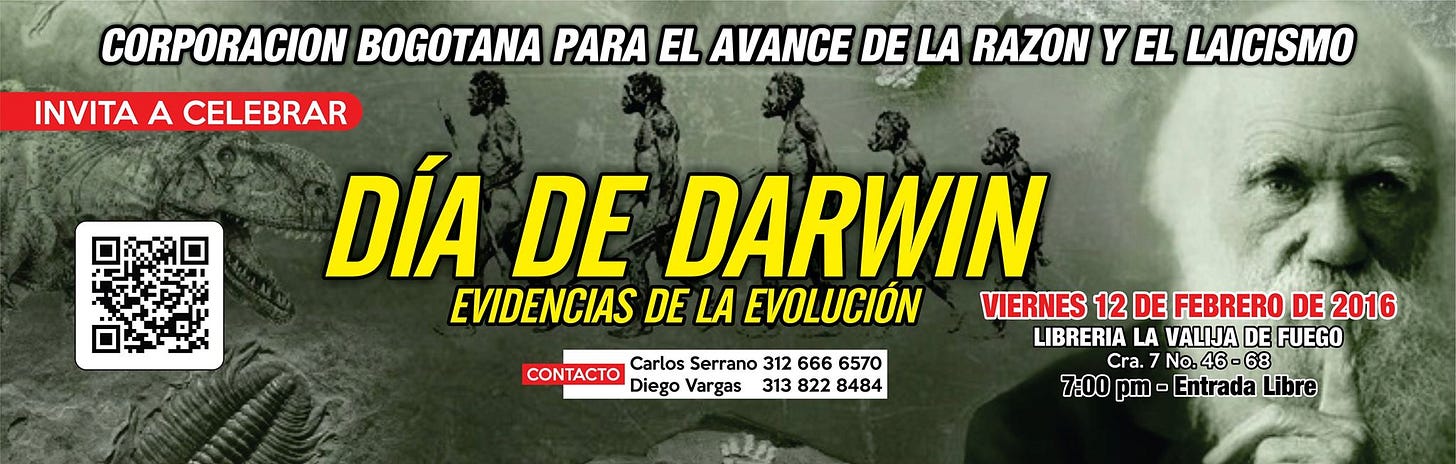 Bogotá Atea invita a la conferencia 'Día de Darwin: Evidencias de la Evolución', que se llevará a cabo el viernes 12 de febrero de 2016, en La Valija de Fuego Café Librería - Editorial, a partir de las 7:00 p.m.