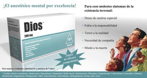 *Posibles efectos secundarios: Intolerancia, dependencia, homofobia, doble moral, alucinaciones, misoginia, esquizofrenia, conformismo, genocidio, violencia, obstinación, dogmatismo, maniqueísmo, odio, autoritarismo, chauvinismo, aletargamiento mental, entre otros.