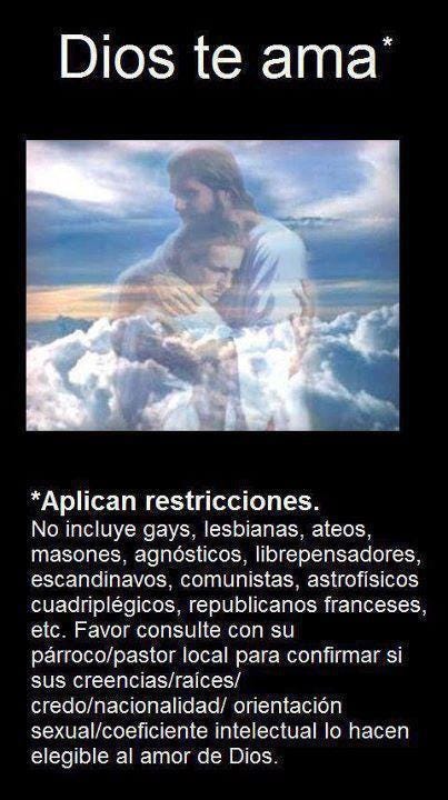 * Aplican restricciones: No incluye a gays, lesbianas, ateos, masones, agnósticos, librepensadores, escandinavos, comunistas, astrofísicos, cuadrapléjicos, republicanos franceses, etc. Por favor consulte con su párroco / pastor local para confirmar si sus creencias/raíces/credo/nacionalidad/orientación sexual/coeficiente intelectual lo hacen elegible al amor de Dios.