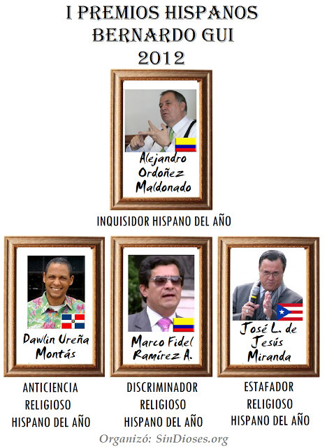 Por si no se habían enterado, en Sin Dioses llevaron a cabo el concurso de premios Bernardo Gui, para "religiosos, o políticos que han usado la religión para discriminar o impedir el conocimiento público de la ciencia", entre cuyos finalistas se encontraba Alejandro Ordóñez.