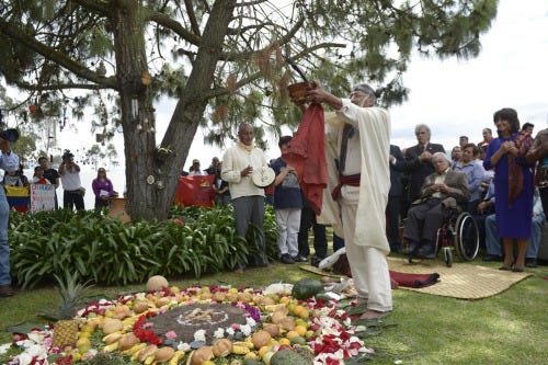 “Con este ritual queremos hacer un petitorio por la salud del comandante Chávez. Nos identificamos con los cambios que ha liderado en Venezuela y nos enorgullece la influencia que tiene en el mundo”, dijo Alberto Taxo, uno de los guías espirituales.