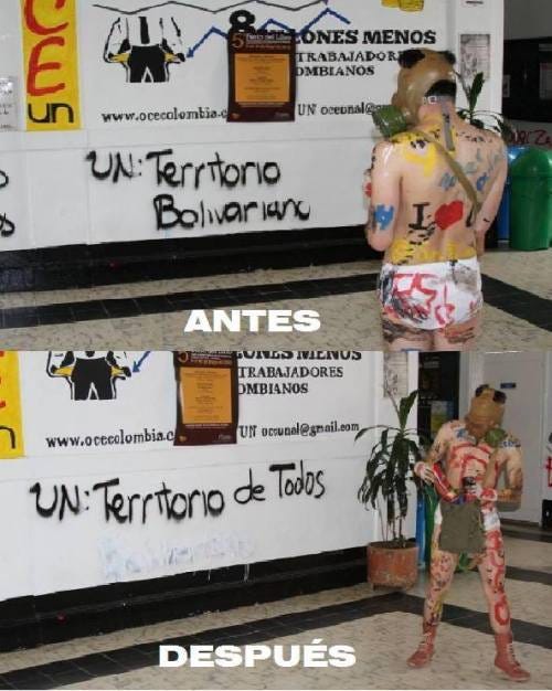 He seguido y escuchado con atención tus intervenciones en radio y tu página de Facebook, y me sorprende entre otras cosas, que de manera tan rápida haya tenido eco tu expresión artística en los medios de comunicación colombianos cuando la expresión también artística de “rayones”, pintas, murales, grafitis, y expresiones de la izquierda han sido invisibilizados por décadas por los mismos medios.
