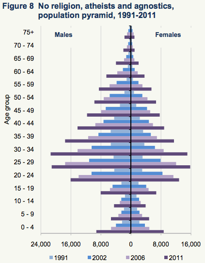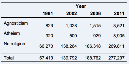 La suma total de los que no tienen religión, los ateos y los agnósticos se cuadruplicó entre 1991 y el 2011, hasta situarse en 277.237 personas. El mayor aumento proporcional fue en el ateísmo que ha pasado de 320 a 3.905 durante los veinte años.