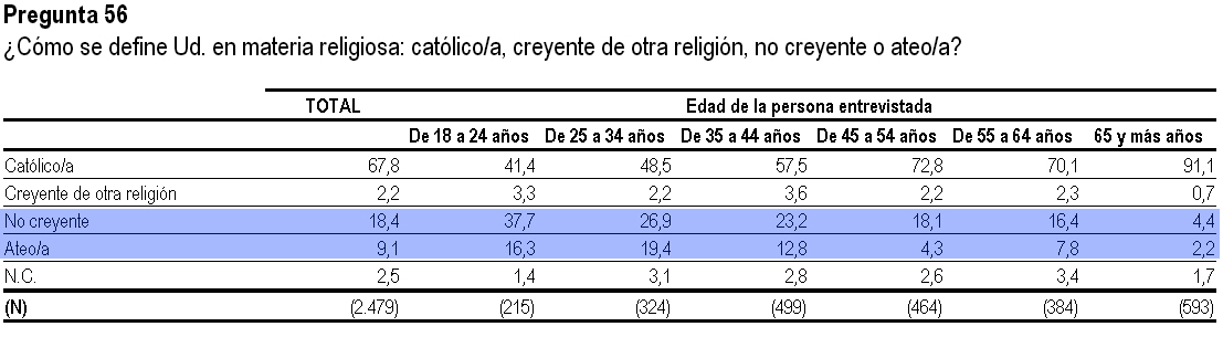 La semana pasada, el Centro de Investigaciones Sociológicas de España publicó su más reciente barómetro —que mide mensualmente la opinión pública española— y resulta que a julio de 2016, entre ateos y no creyentes (a saber qué diferencia entiende el encuestador) suman el 27,5% de la población: