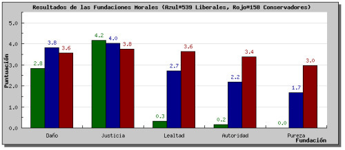 [...] Sus puntuaciones en cada fundación son mostradas en verde(la primera barra en cada grupo de 3 barras). Las puntuaciones de todos los progresistas que han realizado el estudio en nuestro sitio web son mostradas en azul (la segunda barra), y las puntuaciones de los conservadores son mostradas en rojo (tercera barra). Las puntuaciones varían entre 0 (la mínima puntuación posible, es decir, usted rechaza completamente esa fundación) hasta 5 (la máxima puntuación, usted se identifica fuertemente con esa fundación y construye una gran parte de su moralidad a partir de ella)