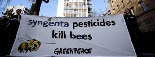 Los activistas desplegaron una pancarta, exigiendo una prohibición en el uso de estos productos, en la que se podía leer "Los plaguicidas Syngenta matan a las abejas".