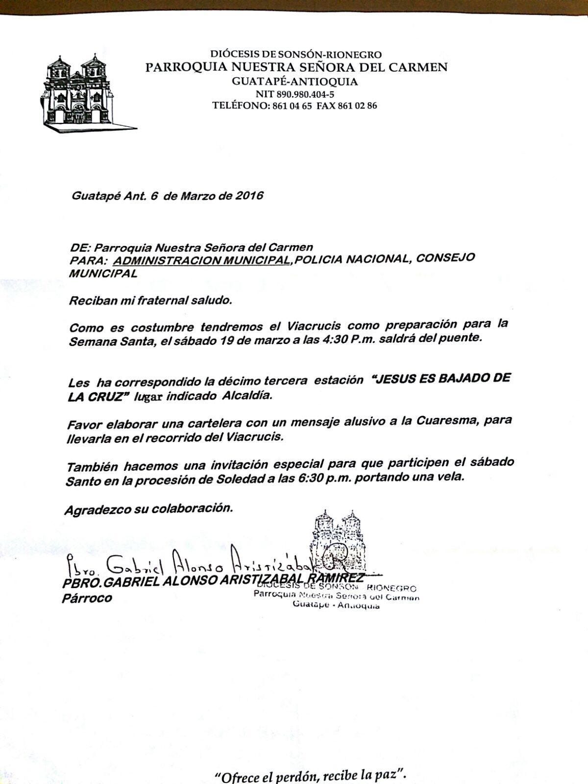 Resulta que en el municipio de Guatapé, el presbítero de la parroquia se da el lujo de envíar instrucciones a la Administración Municipal, a la Policía y al Concejo indicándoles la parte que les corresponde en el Viacrucis (?):