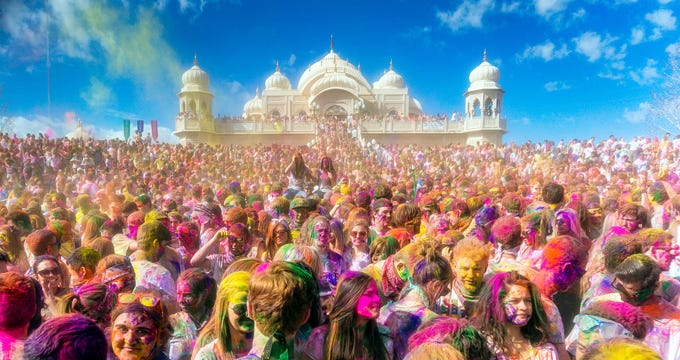 Todos están corriendo por las calles y parques y templos arrojando puñados de polvo brillante de color a todas partes y lanzando globos de agua llenos de agua coloreada a sus amigos y vecinos hasta que todos y todo esté cubierto con un grueso espolvoreado de amarillos brillantes, rojos y verdes y morados . Al terminar parece que una bomba estalló en una fábrica de Crayola. Todo el mundo está feliz y sonriente y bailando y aparentemente viviendo el mejor momento de sus vidas.