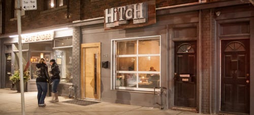 Hitch ya está abierto cerca de Queen y Leslie. Visité el bar en una tranquila tarde de lunes. Debido a que el bar es tan nuevo, no pude encontrar ninguna información sobre él en línea (aparte de la dirección), así que no tenía idea de qué esperar. Cuando entré en el bar, hice hipótesis de la posible fuente del nombre: ¿Es una referencia a una nueva tendencia de camping que incorpora los bares de Leslieville? ¿Es el mismo nombre de la película protagonizada por el papá de Willow Smith? Es el acrónimo de Hipters en Toronto vengan aquí (Hipters In Toronto Come Here)?
