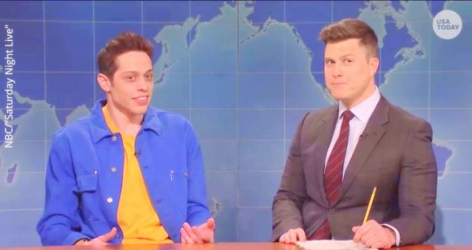 Saturday Night Live (SNL) es un programa de televisión estadounidense que a menudo parodia la cultura y la política contemporáneas; uno de sus segmentos es Weekend Update, presentado por Colin Jost y el comediante Pete Davidson.