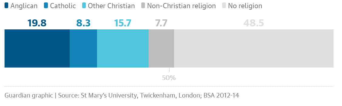 El martes, el Guardian publicó los resultados de un análisis de datos oficiales recogidos en los últimos 30 años. El análisis fue hecho por el profesor Stephen Bullivant de la St Mary’s Catholic University en Twickenham — resulta que en Inglaterra y Gales hay más personas sin religión que cristianos (sumando todas las denominaciones):