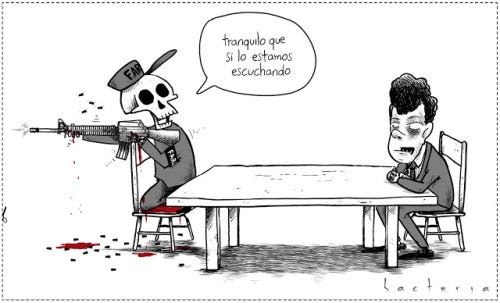 Las Farc secuestran a un norteamericano y luego dicen que lo van a soltar como gesto de buena voluntad (igual que hace unos meses dijeron que no secuestrarían más, también como gesto de buena voluntad). Las Farc asesinan a sangre fría a 15 soldados en Arauca (y se ganan una palmadita en la mano de la ONU: que no sean malos, que el derecho internacional humanitario). Las Farc, en un acto de torpeza sin precedentes en ninguna negociación que me venga a la cabeza, les echan el ojo a las protestas del Catatumbo y ofrecen de oficio sus armas a los que protestan