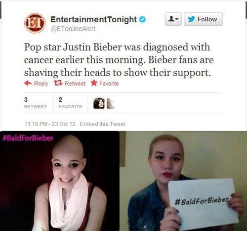 Todo comenzó con el siguiente tweet, emitido supuestamente por la cuenta verificada de Entertainment Weekly: “La estrella del pop Justin Bieber fue diagnosticado con cáncer esta mañana. Sus fans están afeitándose la cabeza para mostrar su apoyo”.