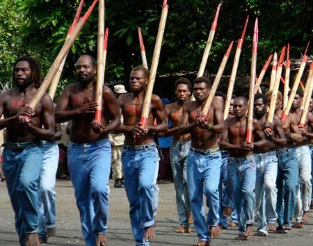 Cada año, el 15 de febrero, los nativos de la República de Vanuatu celebran el John Frum Day parade. Se visten con vaqueros, se pintan USA en el pecho y la espalda y desfilan descalzos ante la bandera americana con sus fusiles de bambú al hombro.