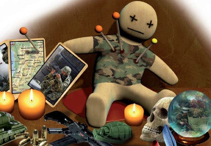 En esto de la fe en los poderes ocultos en la guerra, Colombia, por supuesto, no es una excepción. Desde la célebre escena de las tres brujas que con sus profecías convencieron a Macbeth de que asesinara y fuera a la guerra para convertirse en rey, hasta ocultistas como Aleister Crowley, empleado por la inteligencia británica contra los alemanes en las dos guerras mundiales, la brujería ha tenido un lugar tan pintoresco como destacado en la guerra.