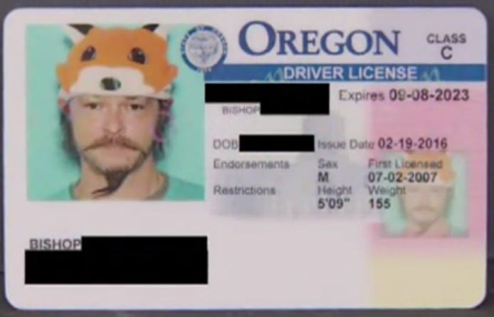 Este es Bishop. Dice que su calvario comenzó el verano pasado cuando fue a renovar su licencia. En honor a su religión, él eligió usar en la foto este sombrero que representa a un zorro.
