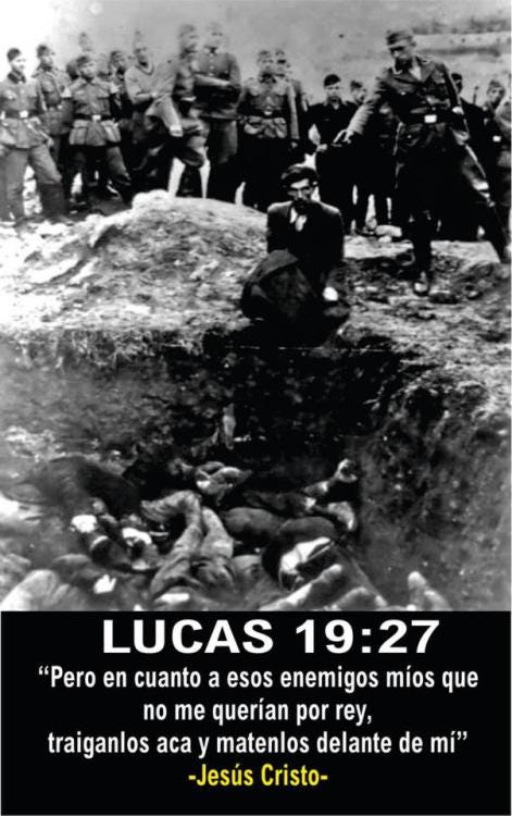Lucas 19:27David Osoriooct 05, 2012CompartirPero en cuanto a esos enemigos míos que no me querían por rey, tráiganlos acá y mátenlos delante de mí.-JesucristoAnteriorSiguiente