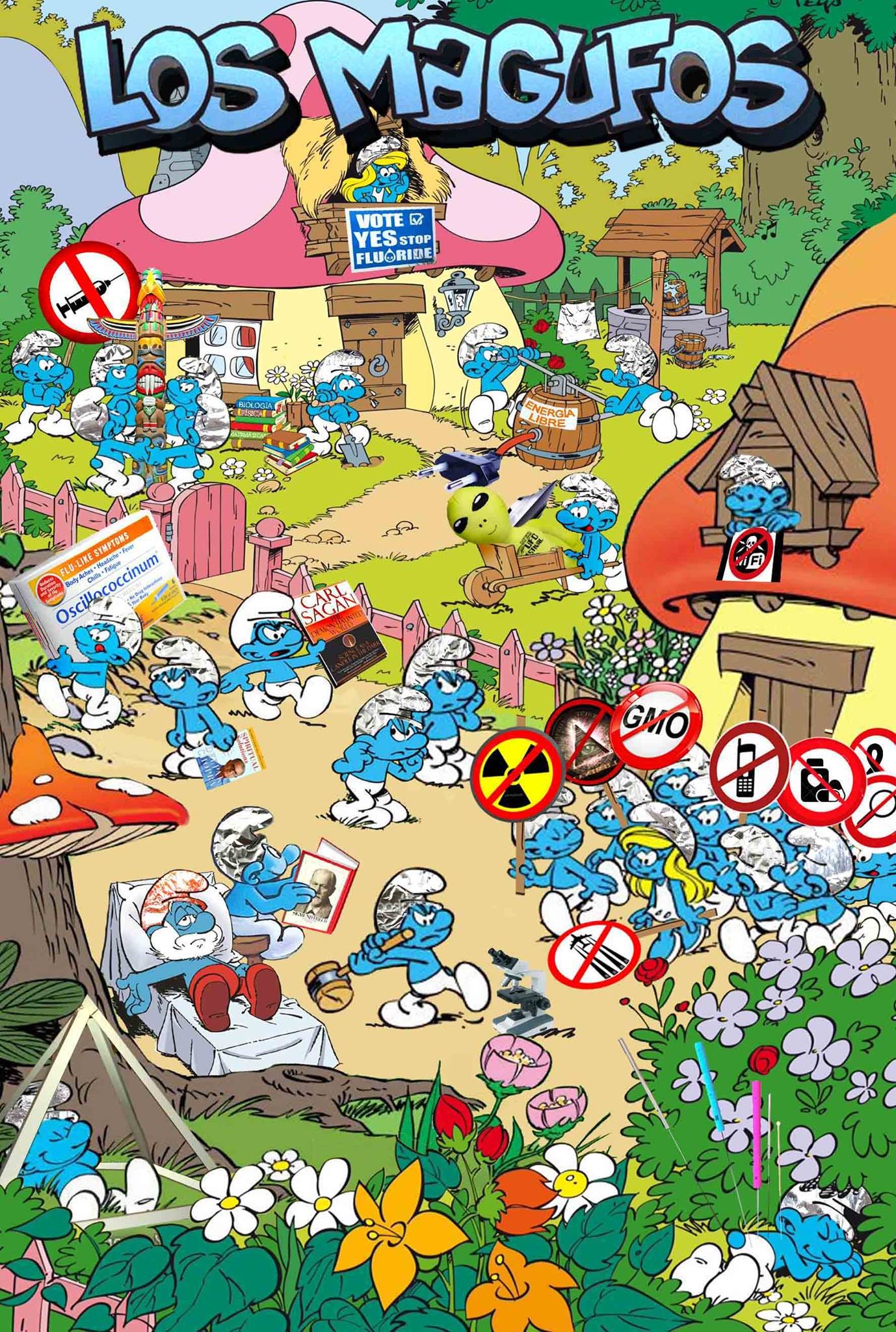 Nótese, además, que hay unos que están rechazando un pitufo que lee El mundo y sus demonios de Carl Sagan, otro que está destruyendo un microscopio, y otro que está enterrando libros.