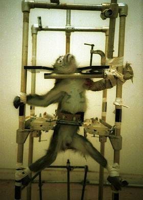 Esta fotografía en concreto fue escenificada por un terrorista de PETA en 1980, su cofundador Alex Pacheco, con objeto de desprestigiar al Dr. Edward Taub y su investigación para enseñar a personas paralizadas a utilizar miembros que no tienen sensibilidad, los estudios de plasticidad neuronal. Pacheco se hizo pasar por voluntario en el laboratorio de Silver Springs y, en una ausencia de Taub, puso mal a los monos en las sillas que se usaban (torturándolos de hecho él, Pacheco) para hacer esta foto. Esto quedó demostrado en dos juicios y cinco investigaciones independientes sobre las prácticas del laboratorio de Taub, que no se parecían EN NADA a esta barbaridad cometida por Alex Pacheco.
