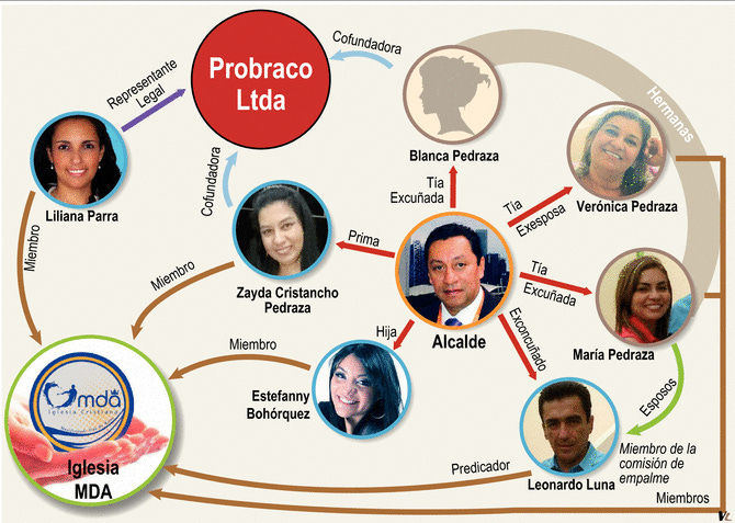 Todos ellos y otros miembros de la piadosa rosca recibieron más de 15.000 millones de pesos en contratos durante la Alcaldía de Bohórquez. Una de las sociedades favorecidas se llama Probraco y fue fundada por la prima del alcalde la pastora Zayda Judith Cristancho Pedraza y por su tía la también pastora Blanca Marina Pedraza.