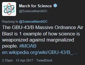 Un tuitero criticó el lanzamiento de la bomba, señalando que cuesta $300 millones de dólares, mientras que arreglar el sistema de acueducto de Flint (Michigan) sólo costaría 200. Entonces, la cuenta oficial de la Marcha por la Ciencia respondió, sumándose a la crítica: